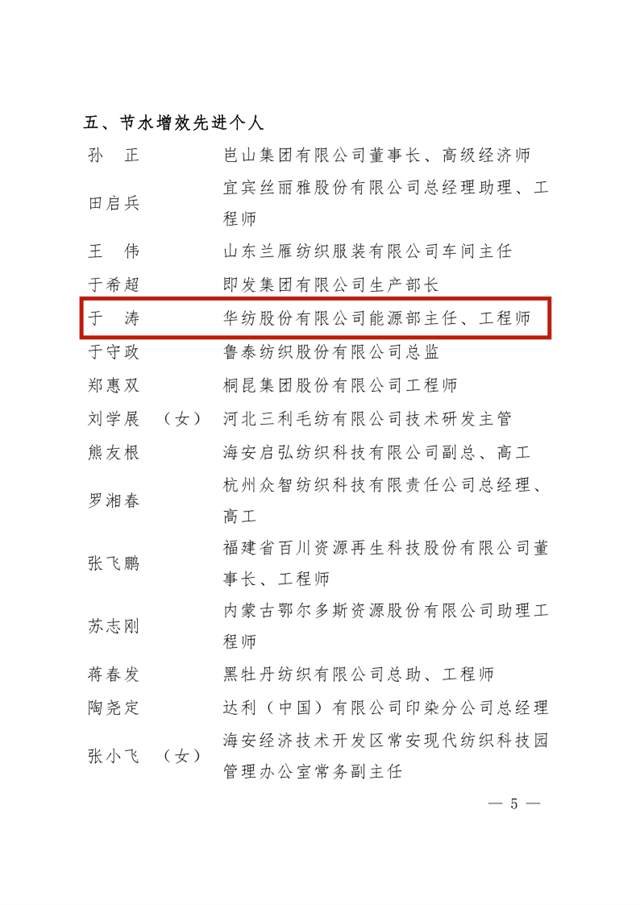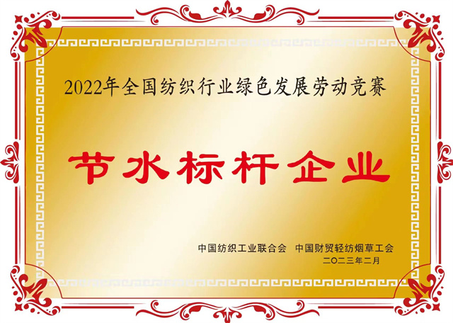 為大力弘揚(yáng)勞模精神、勞動(dòng)精神、工匠精神,組織引導(dǎo)廣大職工為推動(dòng)紡織行業(yè)綠色低碳循環(huán)發(fā)展貢獻(xiàn)智慧和力量。2022年,中國(guó)紡織工業(yè)聯(lián)合會(huì)與中國(guó)財(cái)貿(mào)輕紡煙草工會(huì)組織開(kāi)展了涉及節(jié)水增效、節(jié)能降碳兩個(gè)領(lǐng)域的全國(guó)紡織行業(yè)綠色發(fā)展勞動(dòng)競(jìng)賽。在近日公布的競(jìng)賽結(jié)果的通報(bào)中,公司獲評(píng)“節(jié)水標(biāo)桿企業(yè)”榮譽(yù)稱號(hào)、公司系統(tǒng)工程部能源副總工于濤榮獲“節(jié)水增效先進(jìn)個(gè)人”榮譽(yù)稱號(hào)。